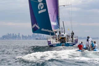 MELBOURNE- Voor team AkzoNobel leek er kort na middennacht Nederlandse tijd in Melbourne maar geen einde te komen aan leg 3 van de Volvo Ocean Race. Bij gebrek aan wind dreef de boot tergend langzaam door de Port Philip Bay richting de finishlijn.