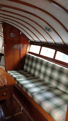 De indeling is nagenoeg origineel. Onder het karakteristieke bolle voordek bevindt zich, in de voorpiek, het toilet. Vervolgens 2 ruime kasten en de keuken met een voormalig stapelbedje. Aansluitend het zitgedeelte, dat gemakkelijk veranderd kan worden in slaapgelegenheid.