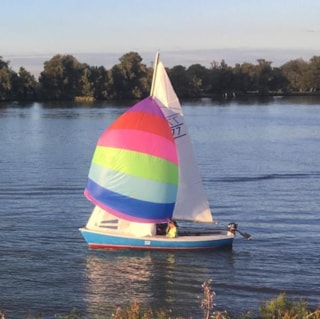 Spi-val te hijsen door stuurman, achterin de kuip.