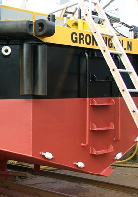 Bij de eerstvolgende verbouwing van het achterschip besloot ik een zwemtrap aan de spiegel te lassen, zodat ik (of iemand anders) er altijd uit kan komen…