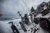 Op de Zuidelijke Oceaan spookt het door de stormachtige wind en metershoge golven behoorlijk. Team AkzoNobel moest noodgedwongen gas terugnemen. Bij het gijpen is op de mast de rails beschadigd voor het grootzeil. Om de schade precies te kunnen vaststellen en een plan van aanpak te kunnen maken voor reparatie werd het grootzeil gestreken. Schipper Simeon Tienpont heeft contact gehad met zijn technische shore crew en het wedstrijdcentrum in Alicante.