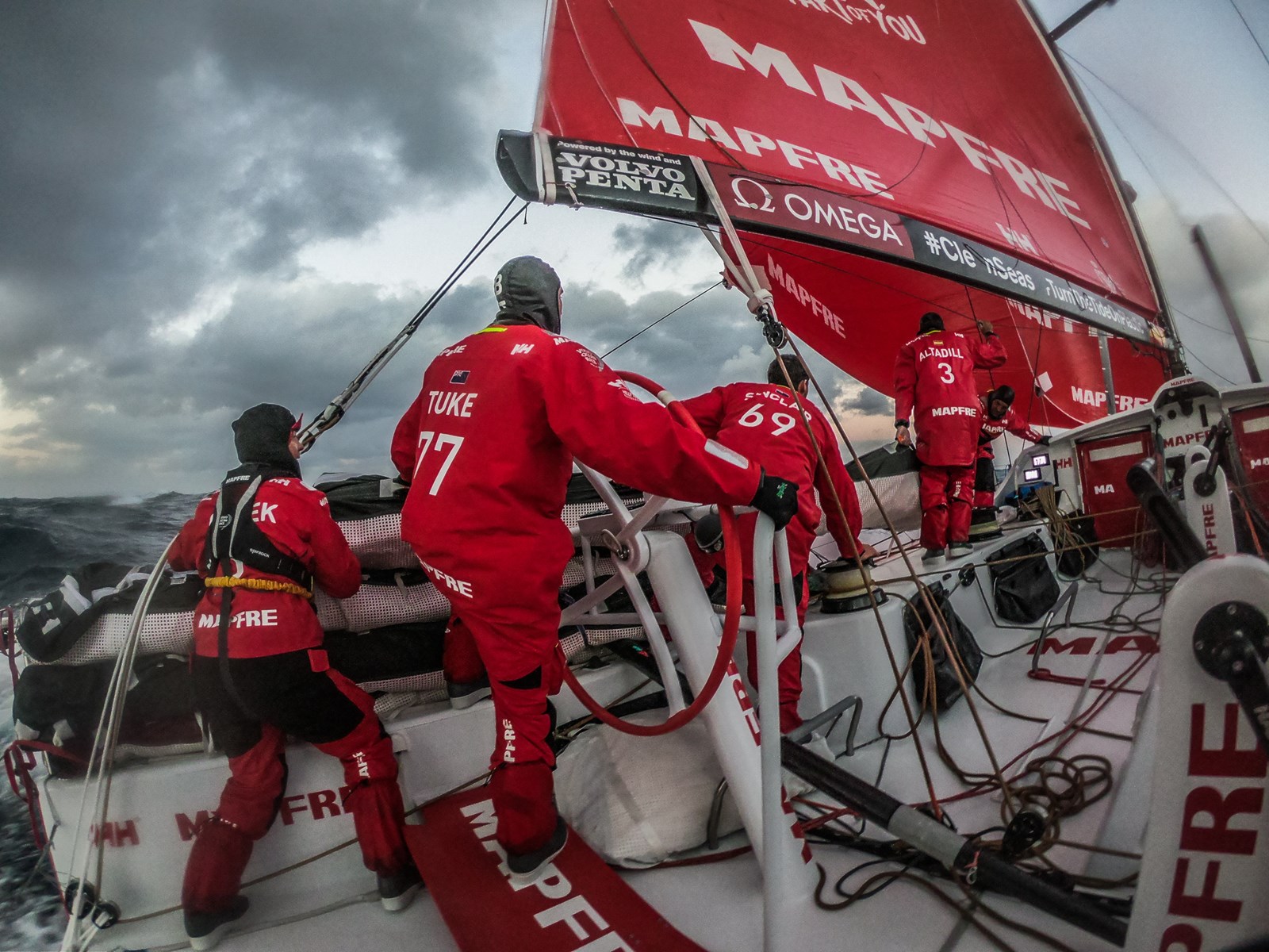 “Het was spannend en druk de afgelopen nacht”, schreef MAPFRE-navigator Juan Vila vanmorgen. “We zijn veel gegijpt in het zicht van Dongfeng en enkele malen heel dicht langs hen gekruist. Op dit moment kunnen we in één lijn blijven varen. De noordwestelijke wind trekt aan en het is bewolkt. De verwachting is dat dit de komende dag zo blijft.”