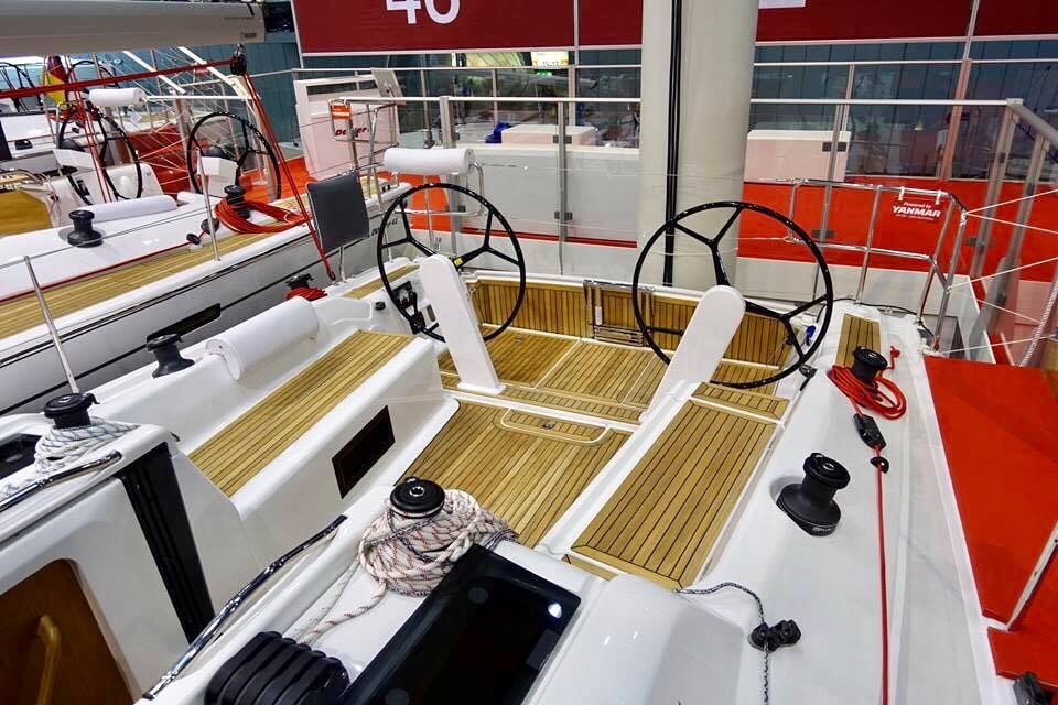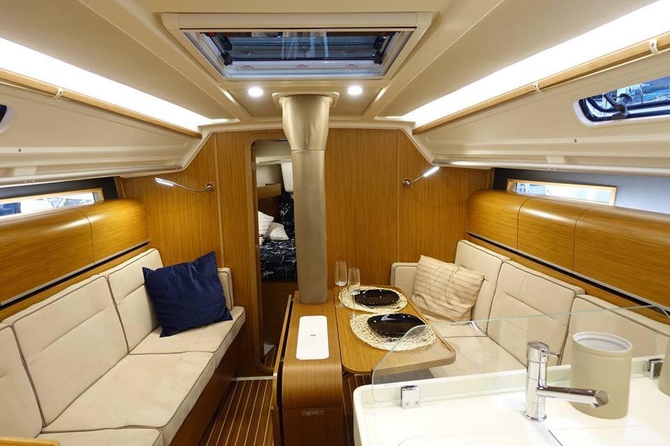 De Dehler 34 is een klassieker in een nieuw jasje. Nieuw is de indeling (keuken aan stuurboord!) en de vele opties waarmee het schip geconfigureerd is (kuiptafel, bad platform). Het interieur is navy met teakhout, het exterieur is wit met teak. Perfecte zeileigenschappen, een comfortabele zit buiten en state-of-the-art apparatuur maken het een feest om mee te zeilen.