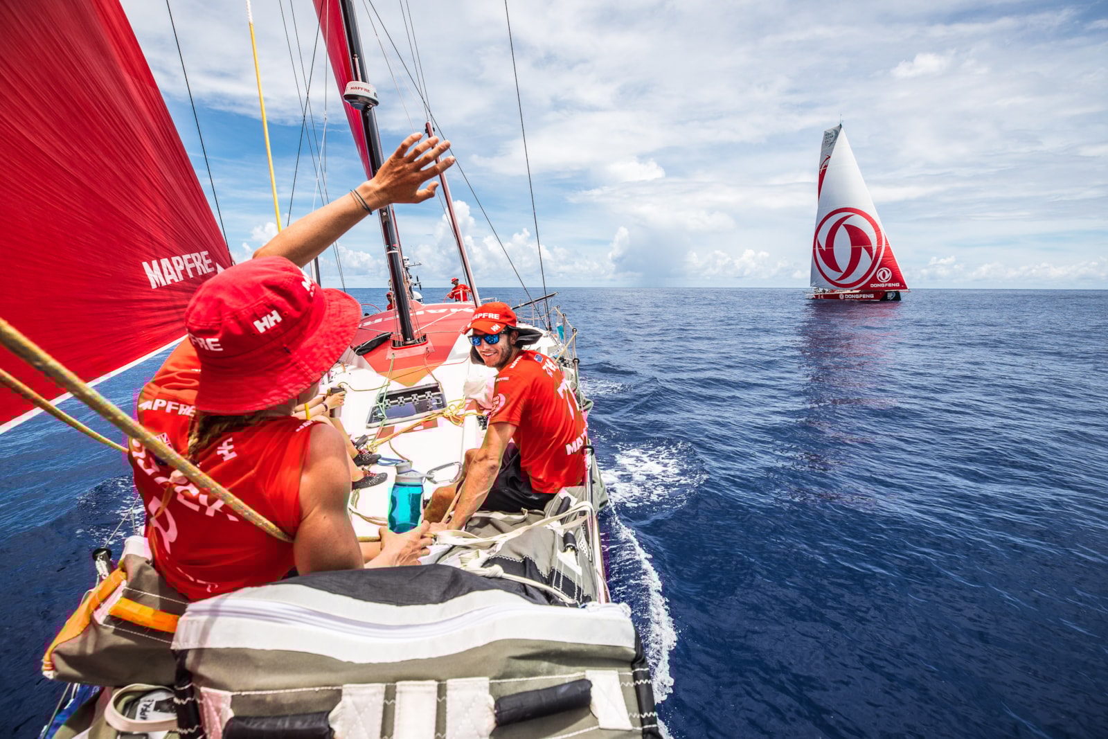 ”Je zou denken dat we met een elastiek aan elkaar vast zitten”, schreef de Nederlandse Dongfeng-zeilster Carolijn Brouwer bij een foto waarop MAPFRE op nagenoeg ‘high-five’ afstand zeilt.