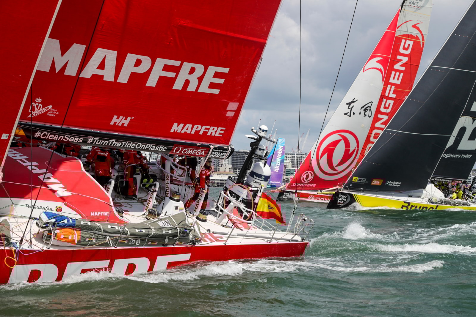 De fans zagen hoe MAPFRE het beste over de startlijn kwam en de vloot langs de boeien in Waitemata Harbour richting Hauraki Gulf leidde. Met Dongfeng, Team Brunel en Turn the Tide on Plastic direct in zijn kielzog.