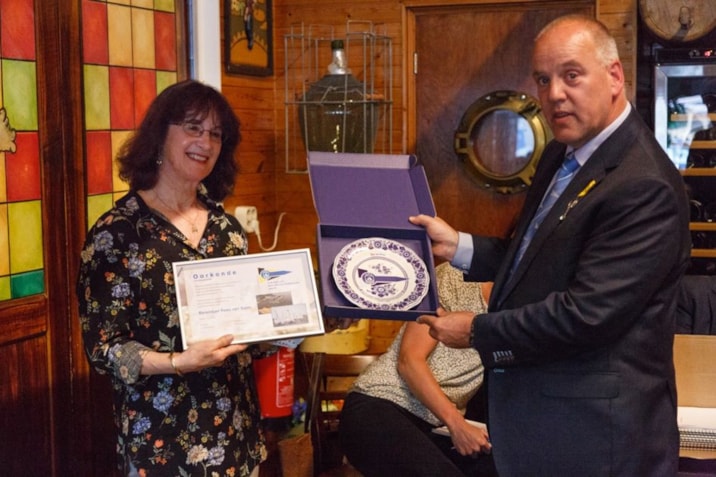 SNEEK- Tijdens de algemene ledenvergadering van de Koninklijke Watersportvereniging Sneek is Beer van Arem postuum benoemd tot erelid. Zichtbaar ontroerd nam zijn vrouw Carien uit handen van KWS-voorzitter Karst Doevendans de bijbehorende oorkonde en een wandbord in ontvangst.