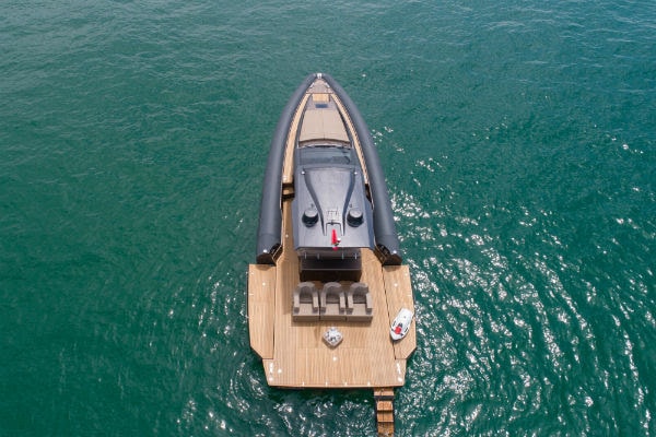 Het innovatieve jacht wordt gekenmerkt door twee speciale vleugelvormige stijlen die van het kajuitdak via de stuurstand doorlopen naar het dak en de geïntegreerde luchtinlaat in het dak. Spectaculair is het achterdek; de kuipwanden zijn neerklapbaar waardoor het achterschip transformeert tot een beach-club van indrukwekkende afmetingen. De bouwers spelen hiermee in op de grotere behoefte het water echt te beleven.