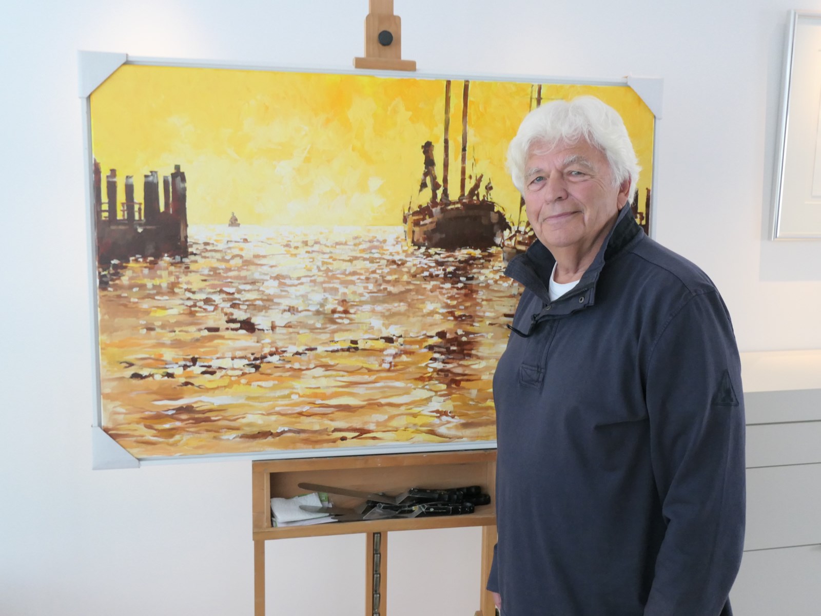 Ad Noorlander is een enthousiast zeiler, die als hij niet vaart in zijn atelier is te vinden. In zijn schilderijen zijn licht en water belangrijke factoren.