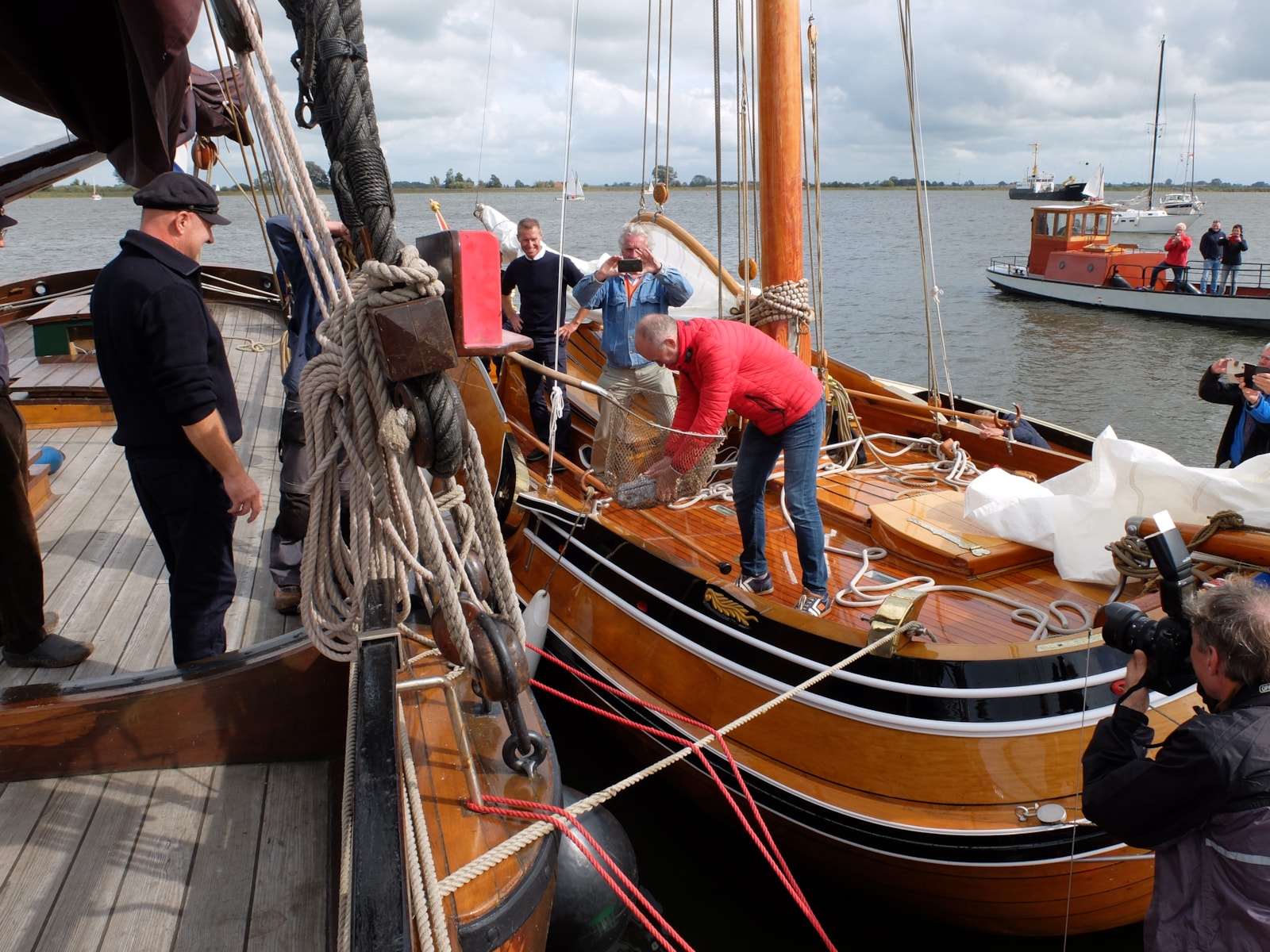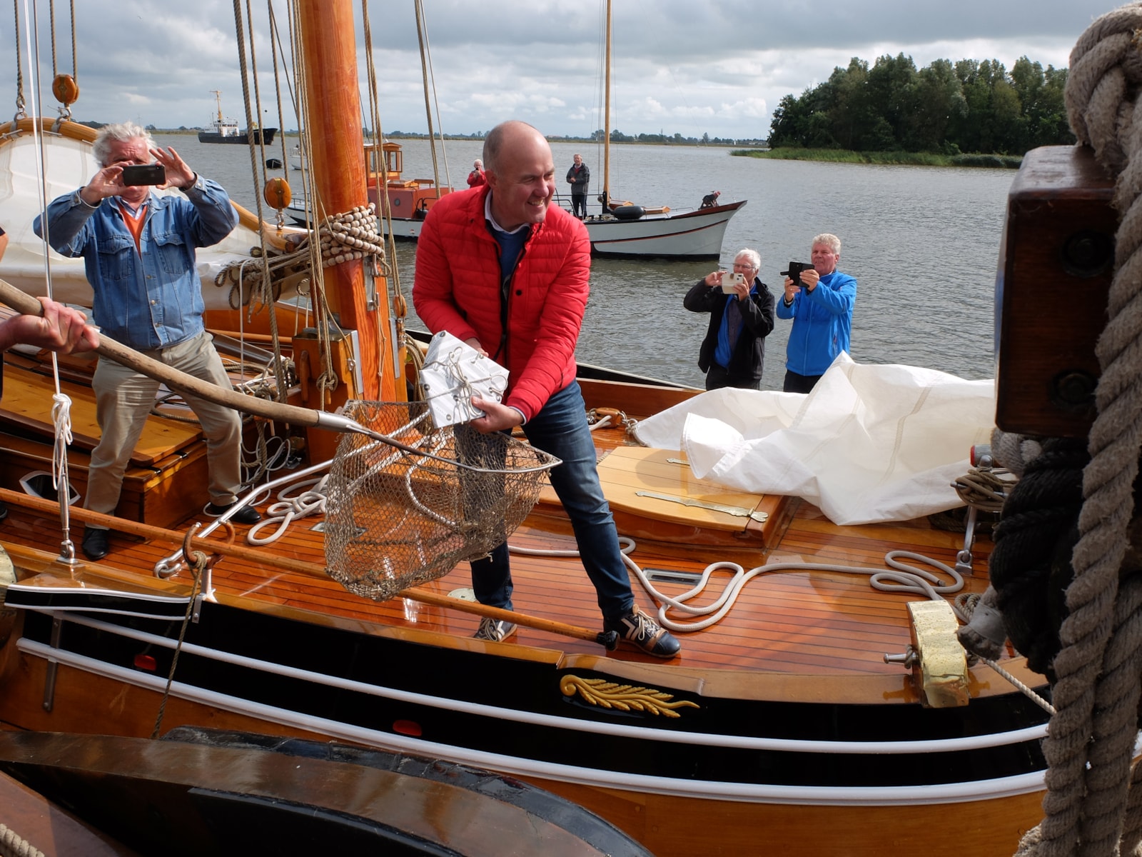 Heeg – Op ludieke wijze is zaterdag door schipper Maarten Stuurman het eerste exemplaar van het boek ’Met de Korneliske Ykes II naar Londen’’ uitgereikt aan Commissaris van de Koning in Friesland, Arno Brok.