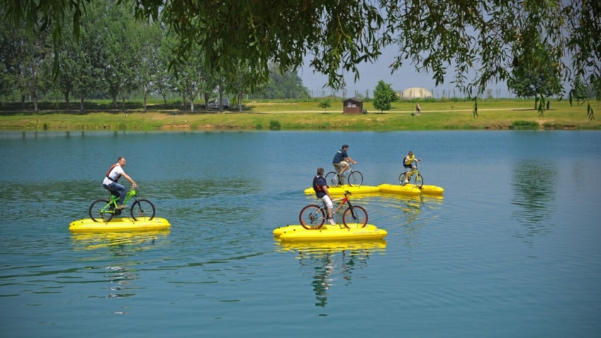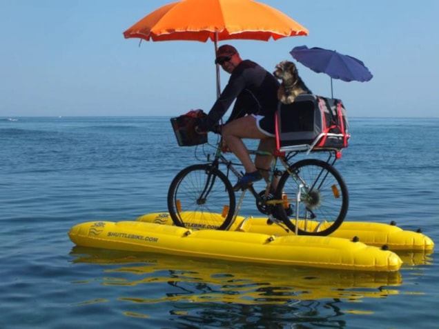 Aanzienlijk goedkoper ben je uit met de Shuttle Bike doe-het-zelf kit van het Italiaanse SDBK Engineering. Met het pakket, waarvan wij een adviesprijs van 1299 euro tegenkwamen, bouw je je eigen fiets om tot waterfiets. Onder je fiets komen twee gele drijvers. Door te trappen drijf je de schroef onder je voorwiel aan. Sturen gaat door het stuur te draaien, zoals je van je eigen fiets gewend bent.