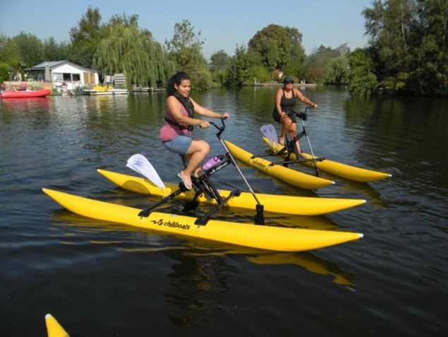 Voor ruim 2500 euro is sinds kort ook de opblaasbare catamaran waterfiets van Chiliboats in Nederland te koop. Volgens de importeur kun je er snelheden tot 15 km per uur mee bereiken en past de fiets in een tas voor het geval je voor de terugreis de trein wilt nemen.