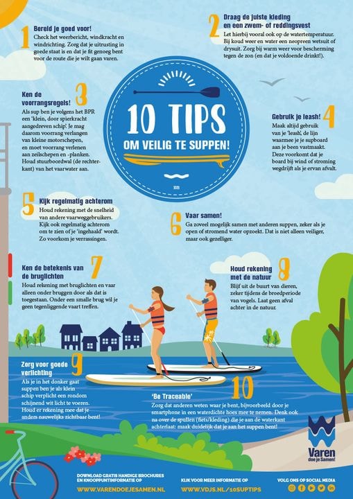 Stand Up Paddling, kortweg suppen, is op dit moment zonder meer de snelst groeiende vorm van watersport. Steeds meer mensen stappen op een sup. Logisch, want het is een laagdrempelige manier om actief op het water te zijn, of juist om te ontspannen. Om veilig te kunnen suppen heeft Varen doe je Samen een flyer gemaakt met tien tips die we graag met je delen. Ga je voor het eerst suppen, volg dan eerst de online cursus op Watersport-TV.