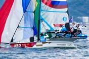 Bart Lambriex en Pim van Vugt staan op een zevende in klassement bij de 49er mannen met een score van 13-14-7. Met heel weinig wind komt dit team snelheid te kort.