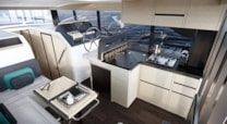 De kajuit is lekker licht en is op gemak en relaxen gericht ontworpen. Buiten de verschillende hutten kun je ook nog een slaapplek maken van de L-bank rond de tafel aan bakboord en daar is zelfs gedacht aan een privacy gordijn. Aan stuurboord is de kombuis met elektrisch kooktoestel, koelkast, lades en een kunststof aanrechtblad. Overal is lichte stoffen bekleding gebruikt, waardoor het geheel bijzonder rustig oogt. Bijzonder is het glazen luik op de motorkamer, waardoor je ziet hoe mooi de techniek is geïnstalleerd. De werf krijgt veel vragen naar deze doorkijkplaat maar helaas is deze alleen voor tentoonstellingsdoeleinden ontwikkeld en niet te bestellen. De stuurplek is precies zoals je mag verwachten: comfortabel en geschikt voor zowel zittend als staand sturen. De bestuurdersbank is breed genoeg voor 2 personen en de schuifdeur ernaast is superhandig bij het afmeren.