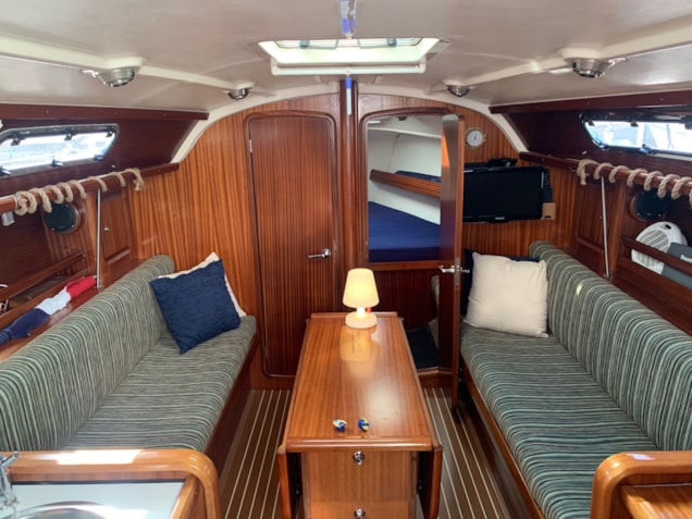 De praktische en ruime kuip van deze Bavaria 34-3 is voorzien een buiskap met aanritsbare kuiptent. De buiskap is in 2021 gereinigd, opnieuw gestikt en voorzien van nieuwe ramen. Vanachter het roer heb je een goed overzicht en controle over de boot. Op de stuurstand zijn de navigatie-instrumenten ingebouwd met onder meer de bediening voor de autopilot en een Raymarine ES95 kleuren kaartplotter. Het zwemplateau met buitendouche is gemakkelijk bereikbaar dankzij de uitneembare achterbank. Het interieur met stahoogte in de salon is ruim en praktisch ingericht met een uitstekende afwerking van het mahonie houtwerk en heeft veel kastruimte. De gezellige salon is uitgerust met twee grote en comfortabele banken waarvan de bekleding in 2022 geheel is vernieuwd. Alle interieurverlichting is uitgevoerd in warm wit LED. De L-vormige keuken aan bakboord is ruim en modern ingericht en uitgerust met een 3-pits fornuis, oven, Nespresso koffiezetapparaat, compressor koelkast en een gootsteen waarvan de kraan in 2022 is vernieuwd. De boot wordt geleverd inclusief het complete keukeninventaris en servies in goede staat.
