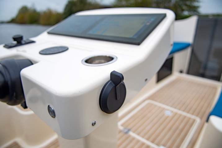 Laden kan met laders van 1,5 tot 4,5 kW. De geteste boot heeft een 3kW lader die je in 3,5 uur van 20 naar 80% accuvulling brengt. Alle systemen zoals besturing, laden, het schakelen van elektrische componenten en joystick control zijn geïntegreerd in een computer, die is verbonden met het 4G netwerk. Zo kun je op afstand updates ontvangen of storingen worden uitgelezen. Op de stuurconsole zijn twee mooie geïntegreerde displays op de stuurconsole, waar je alles intuïtief kunt installen en monitoren. Daar kun je ook draadloos je telefoon opladen. De zitplek is fijn en voldoet goed. Je hebt daar uitstekend overzicht over de boot en kijkt gemakkelijk over het kajuitje heen. Achterin kunnen naast de stuurman anderen languit tegen de spiegelbank zitten.