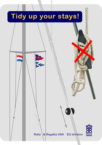 Wanneer je meerdere club of -seinvlaggen hijst wordt de vlaggenval snel een slordige bos op je stagkikker. Met deze kleine slimme knop-kikker is dat verleden tijd. Hij is verschuifbaar langs de stag en volgt de wisselende lengte van je val. Die blijft dus altijd strak belegd. Opgeruimd staat netjes.