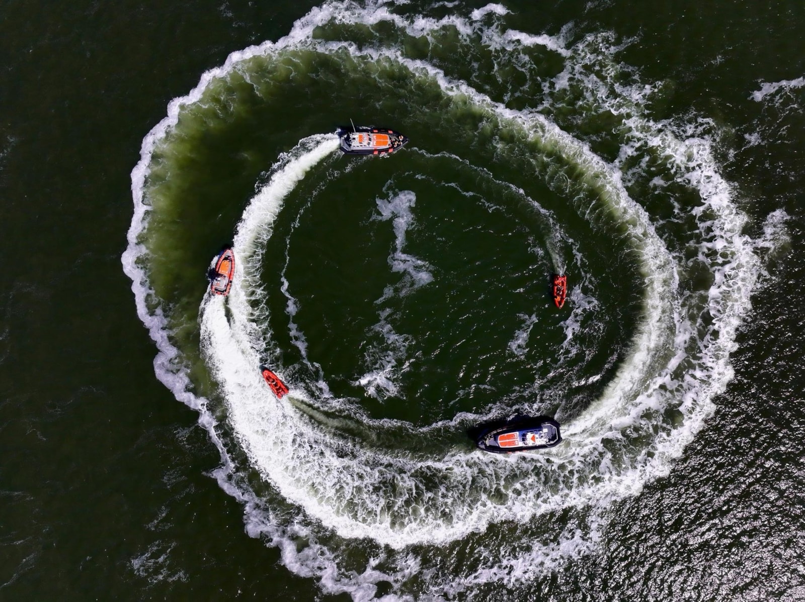 Reddingboten van KNRM-reddingstations Harlingen, Vlieland en Terschelling varen als eerbetoon aan alle overleden niet geredde personen een ronde om de KNRM-tulp ’Tara’ op de Waddenzee. Fotograaf Coen de Jong.