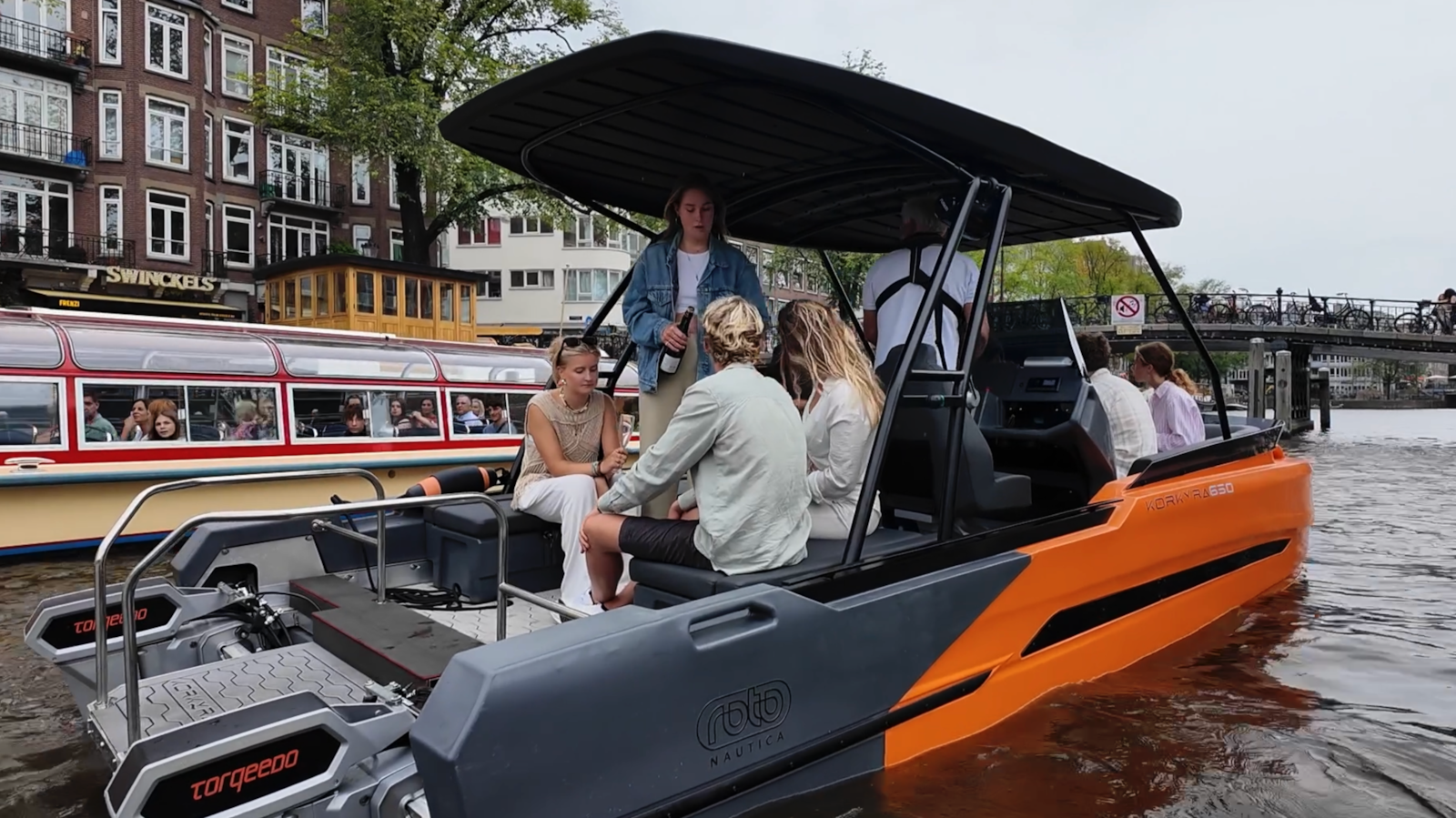 De Korkyra 650 maakte haar Nederlandse debuut op de Hiswa te water in september j.l. en een paar dagen na de beurs is Watersport-TV uitgenodigd voor een vaarimpressie in en rond Amsterdam. Op een trailerhelling langs het IJ wordt de boot te water gelaten. Importeur Gerke Smakman heeft nog even snel een doorvaartvignet aangeschaft zodat we koers kunnen zetten naar het centrum voor een tochtje door de grachten.