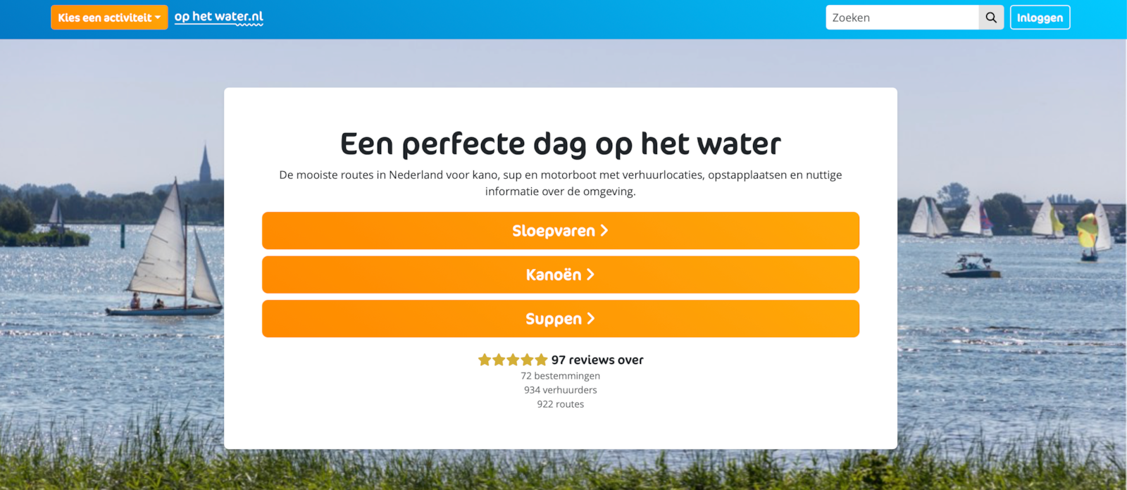 Een platform voor iedereen die droomt van een perfecte dag op het water. Zo introduceert het Watersportverbond Ophetwater.nl. Op de site tref je een overzicht van routes voor kano’s, sups en sloepen. Het doel is om specifiek ongeorganiseerde watersporters te voorzien van alles wat nodig is voor een mooie dag op het water.